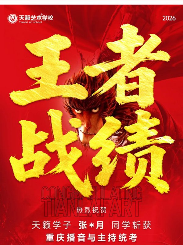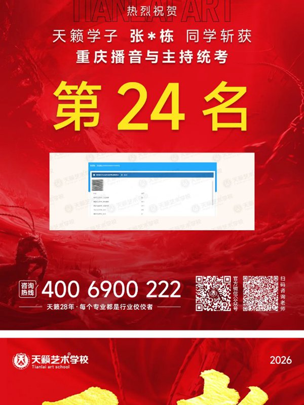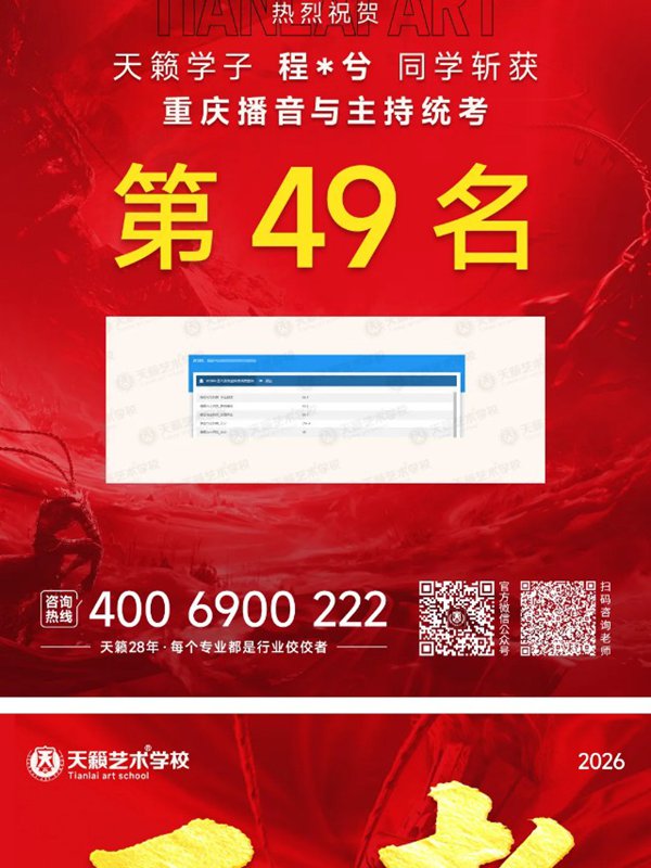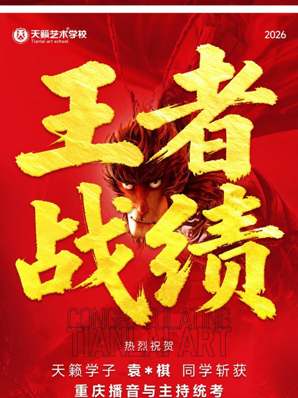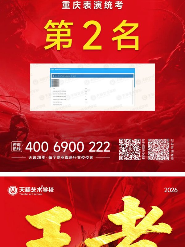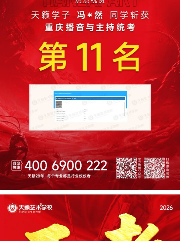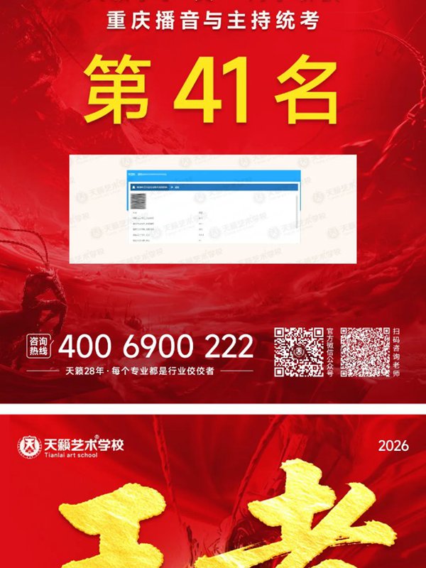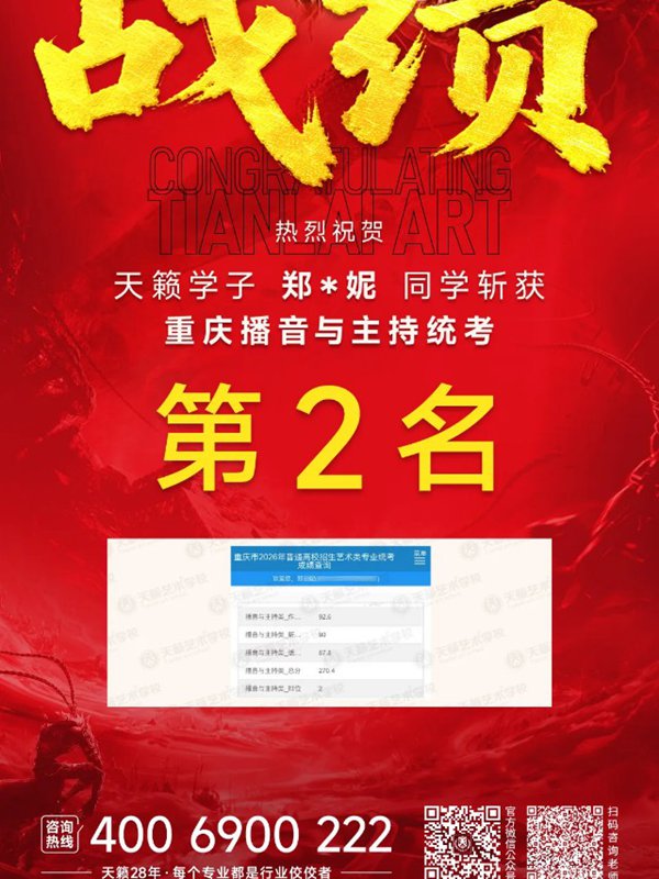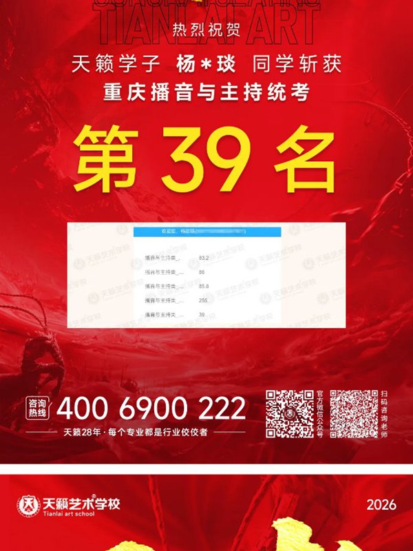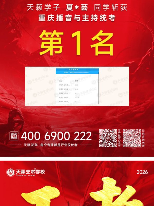2026年重庆天籁影视传媒专业统考战绩闪耀,分别斩获重庆播音/导演第一名,播音/表演/服表第二名,导演第三名,实力定义行业巅峰!