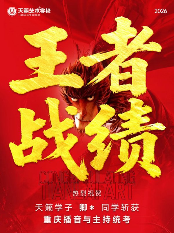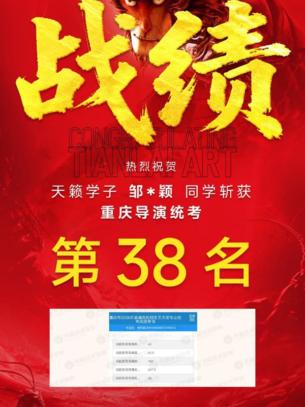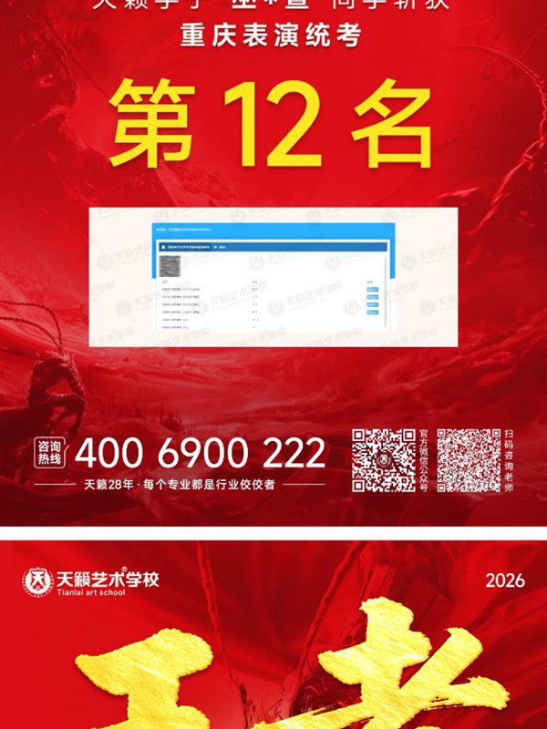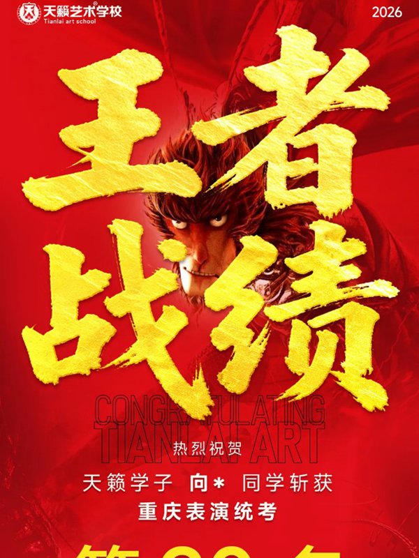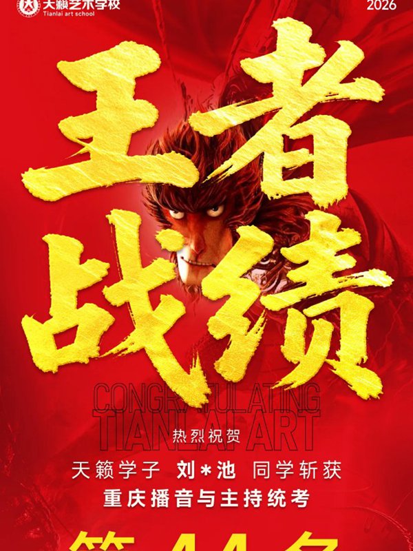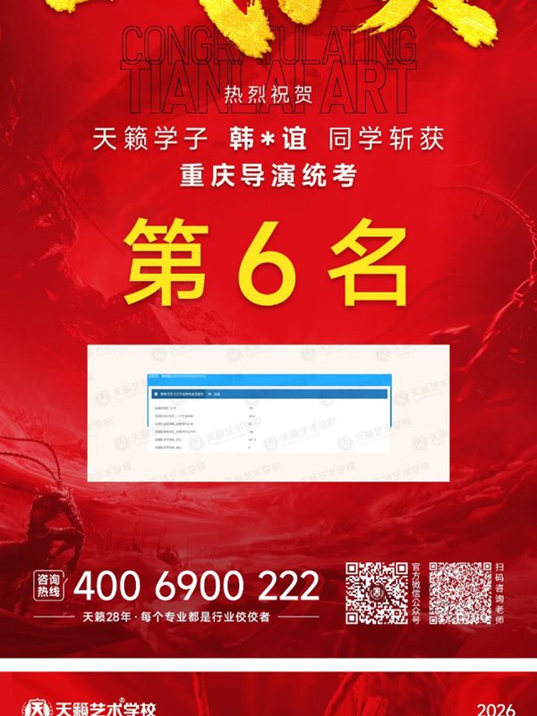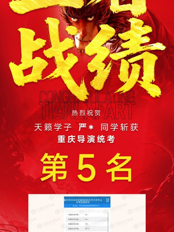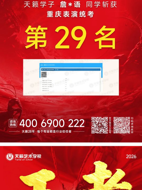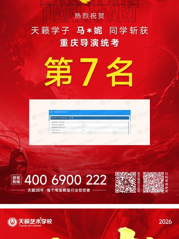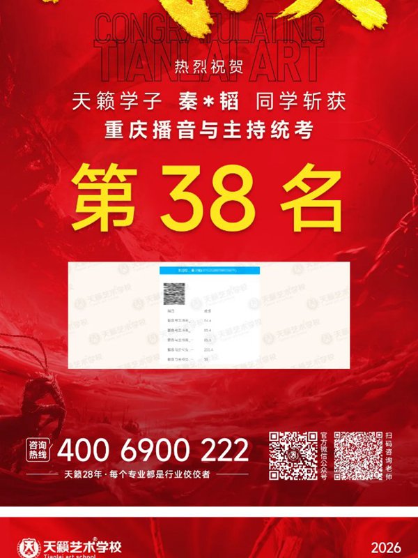 2026年重庆天籁影视传媒专业统考战绩闪耀,分别斩获重庆播音/导演第一名,播音/表演/服表第二名,导演第三名,实力定义行业巅峰!