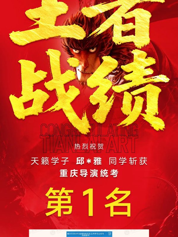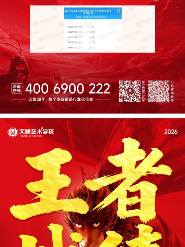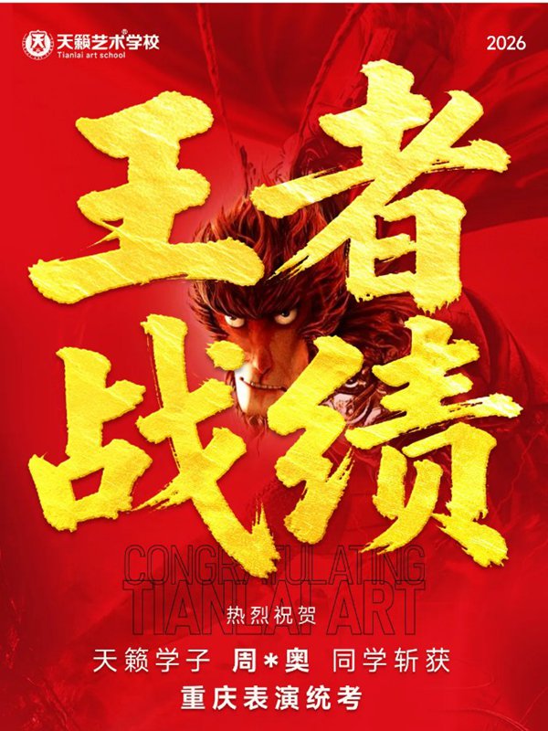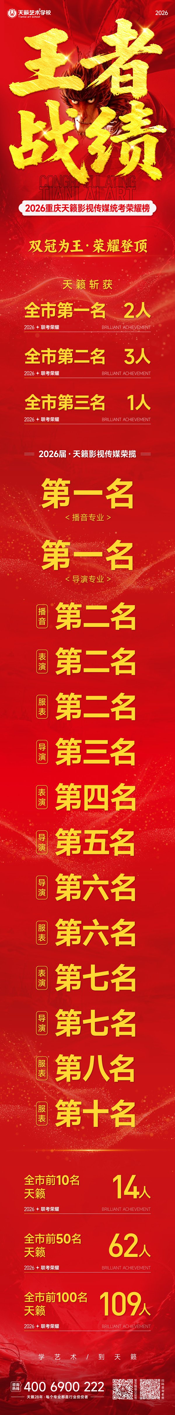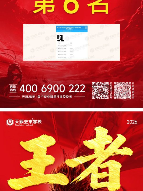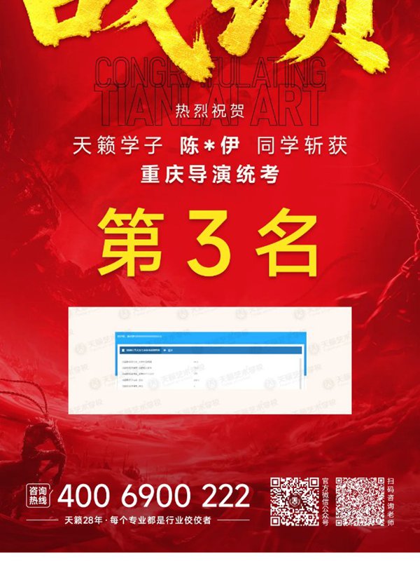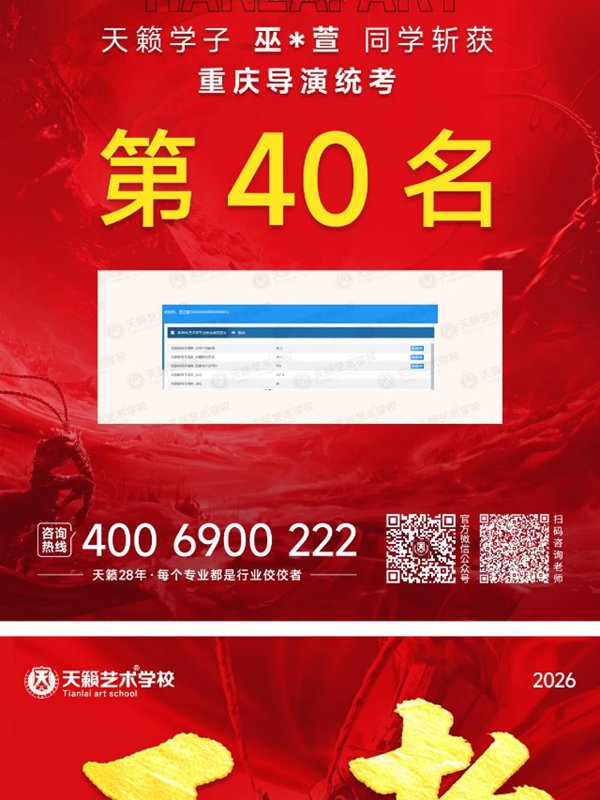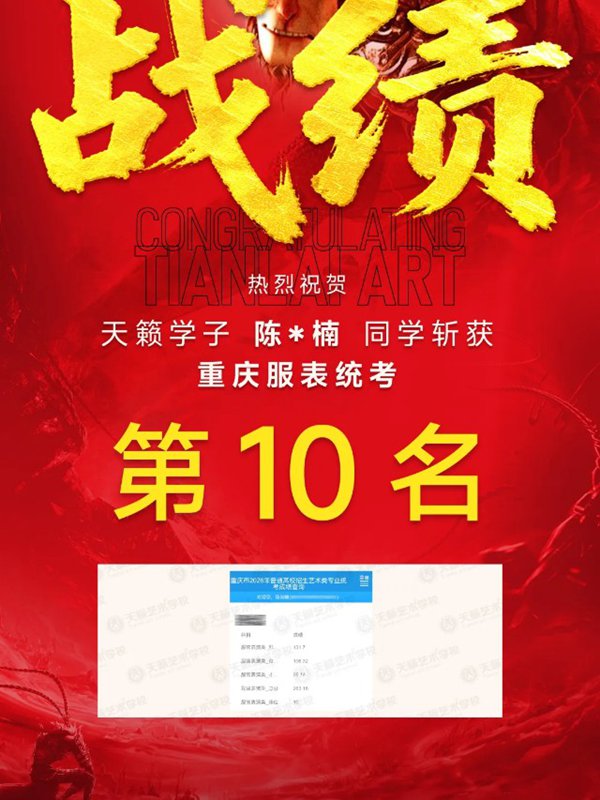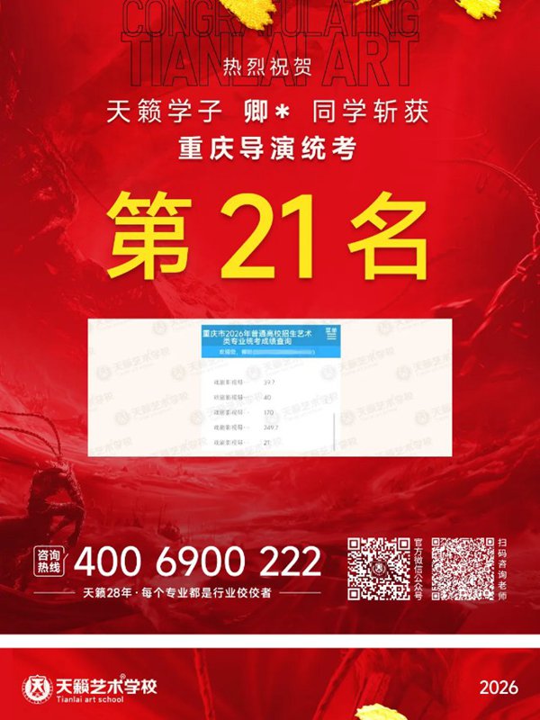 2026年重庆天籁影视传媒专业统考战绩闪耀,分别斩获重庆播音/导演第一名,播音/表演/服表第二名,导演第三名,实力定义行业巅峰!